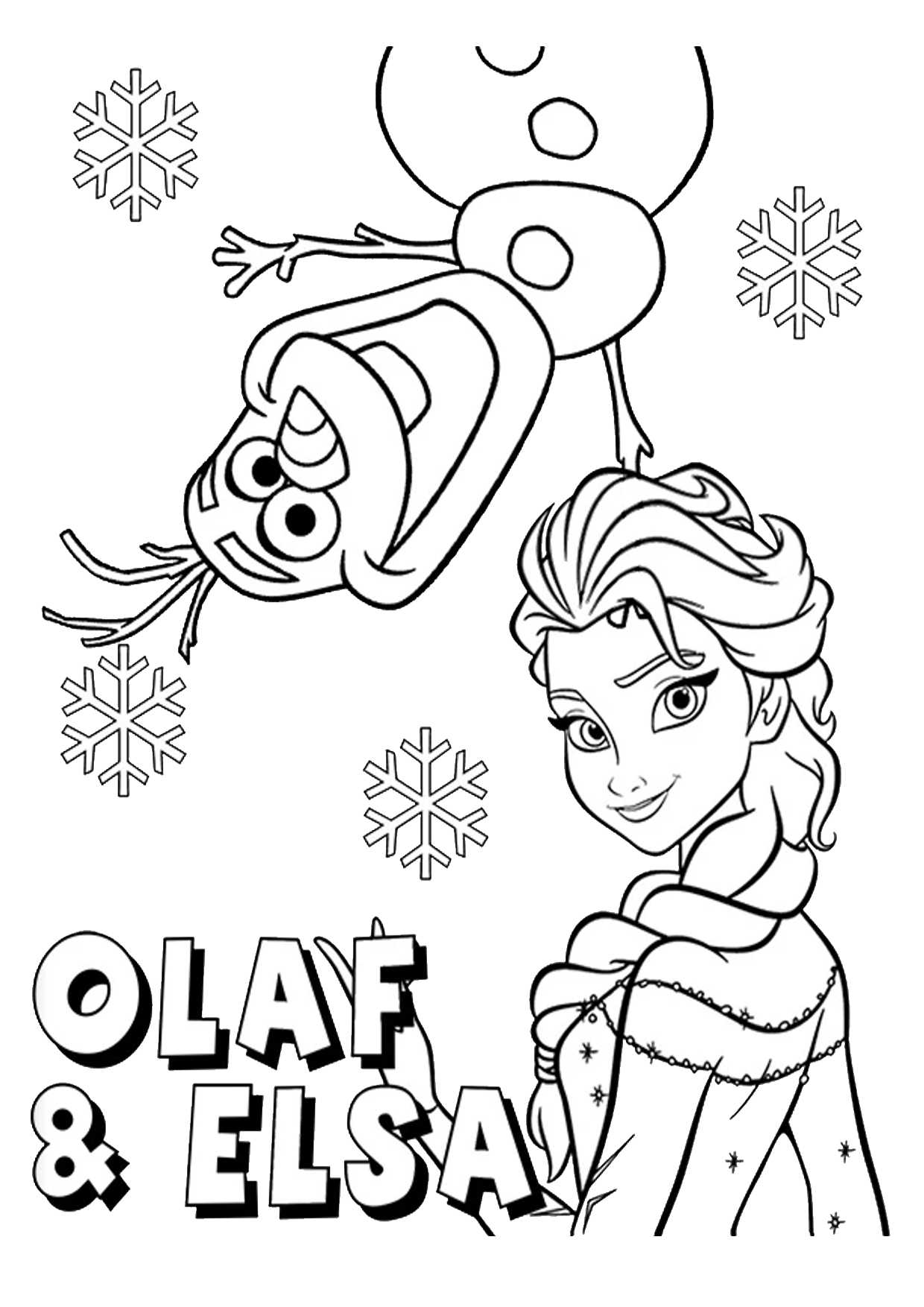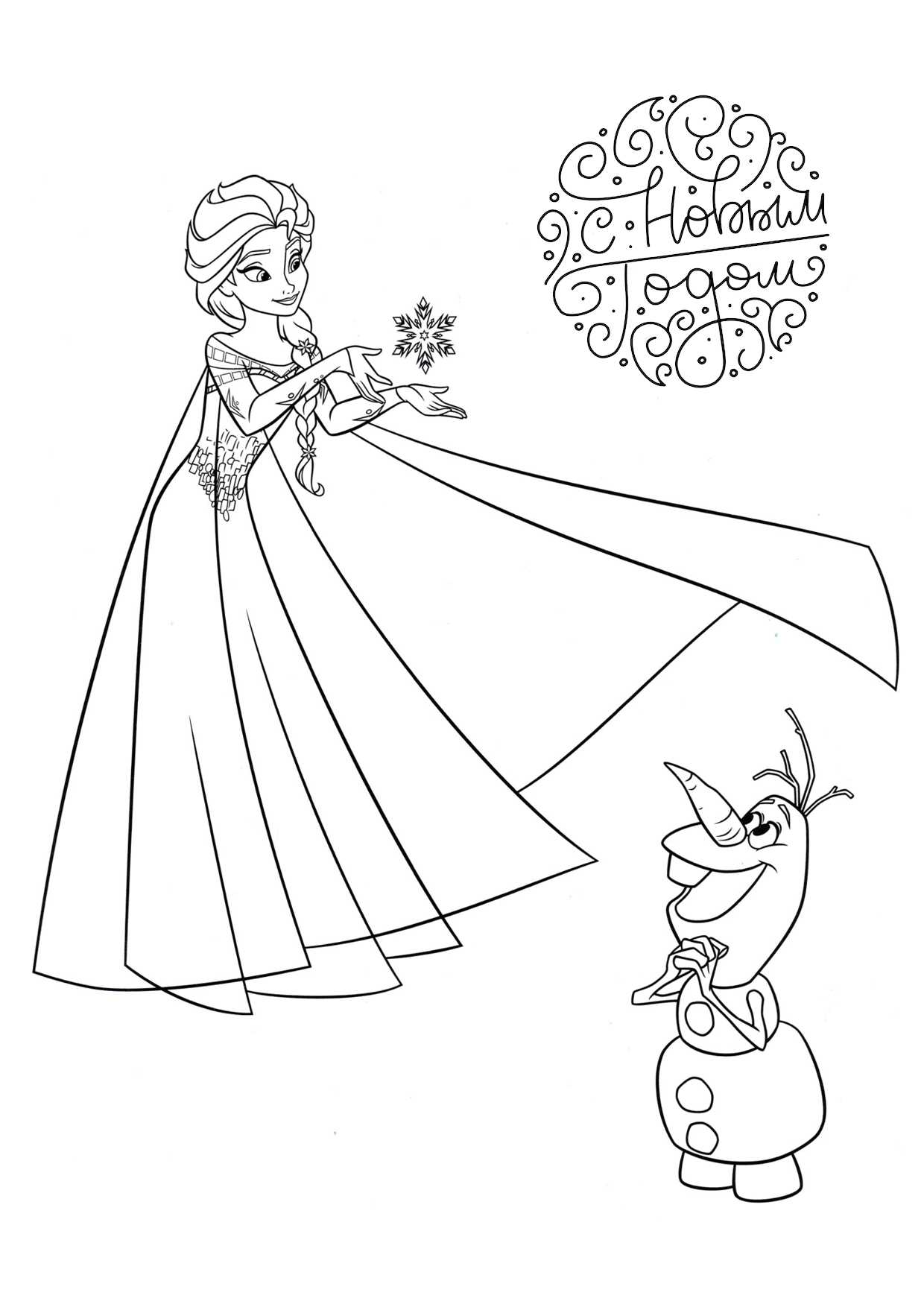 Олаф и Эльза на раскрасках ниже очень понравятся девочкам. Костюм прелестной принцессы можно украсить максимально празднично, помазав нужный участок клеем ПВА и посыпав блестками сверху.