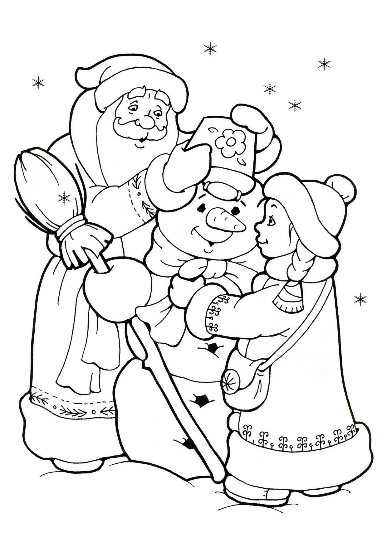 Классическая раскраска с Дедушкой Морозом, одевающим Снеговика — лучший выбор, чтобы распечатать ребенку 5-6 лет. Много деталей — море творчества!