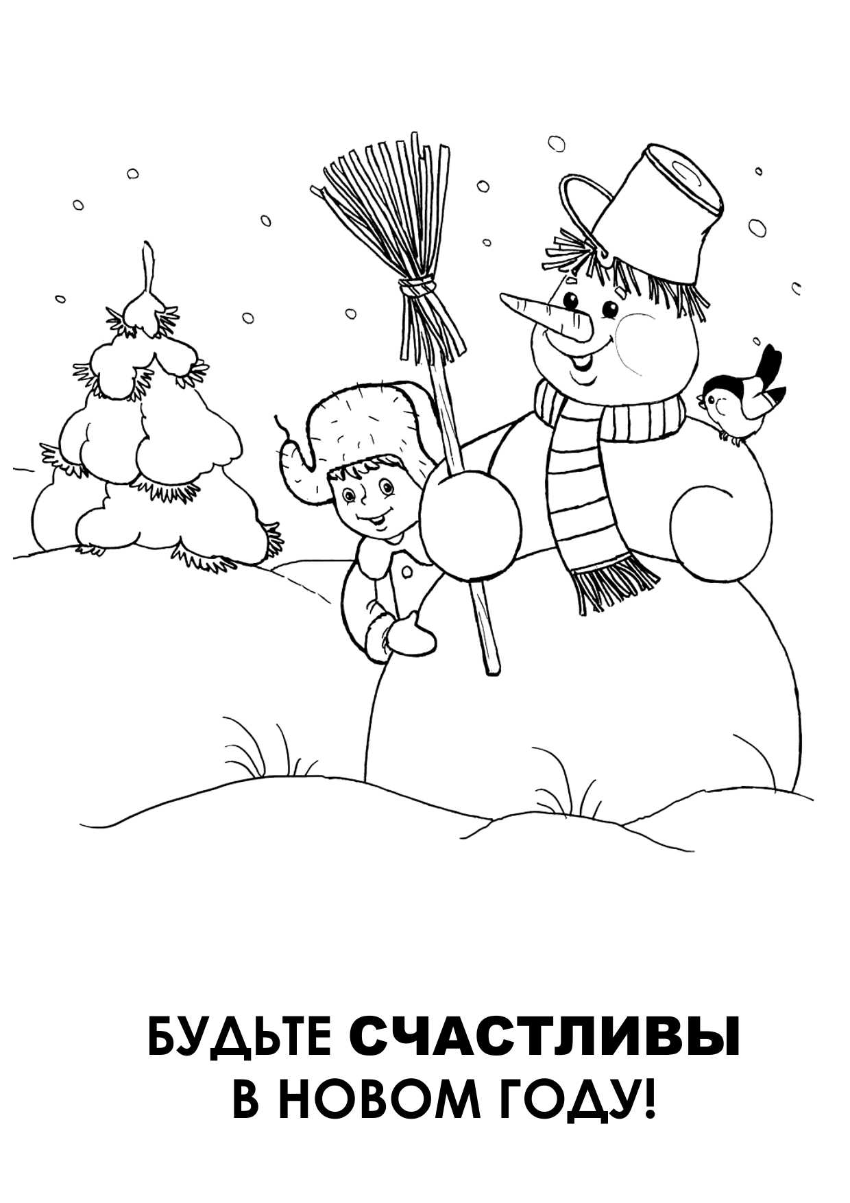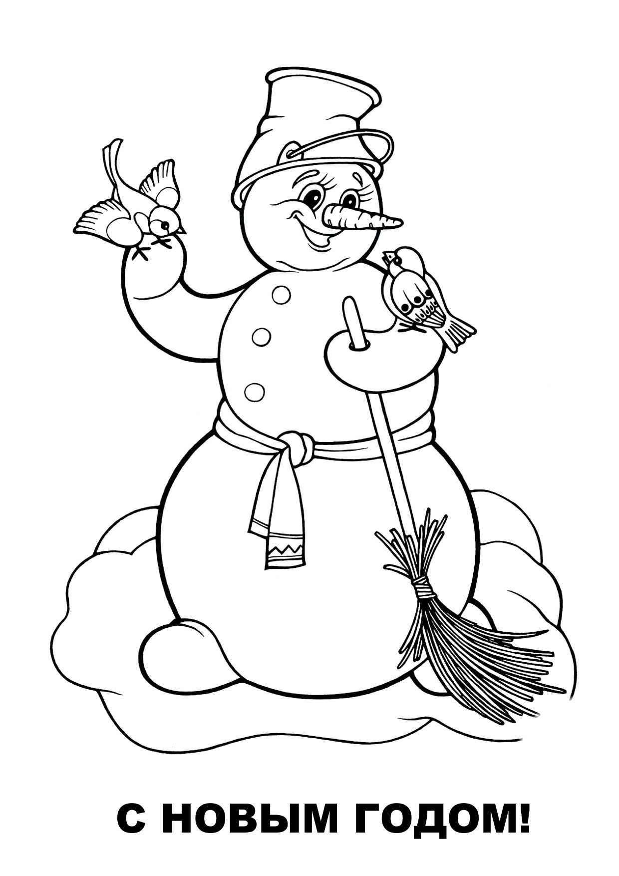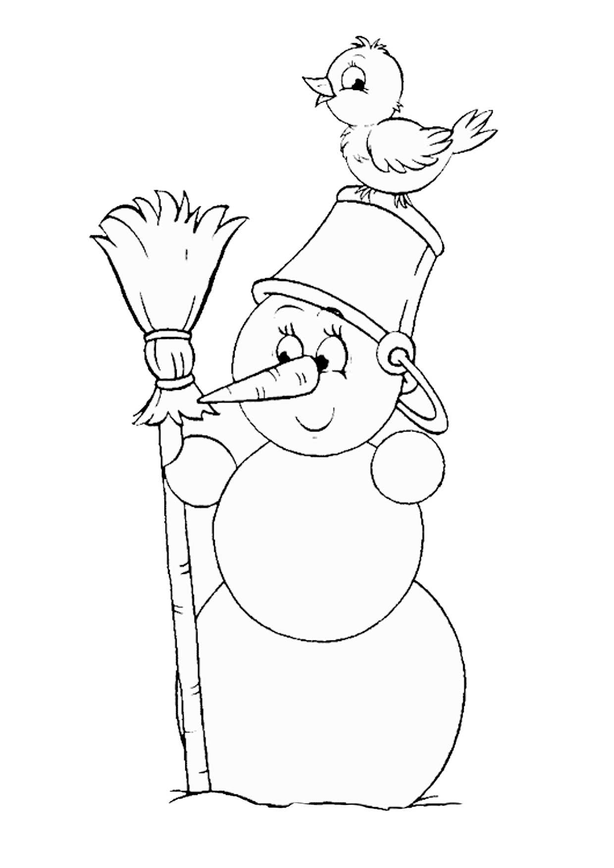 Классический простой снеговик для детей 3-4 лет на раскраске с метлой, ведром и птичкой понравится вашим малышам.Мы счастливые друзья — Снеговик, снегирь и я! Любим зиму, санки, снег, Новый год и громкий смех!