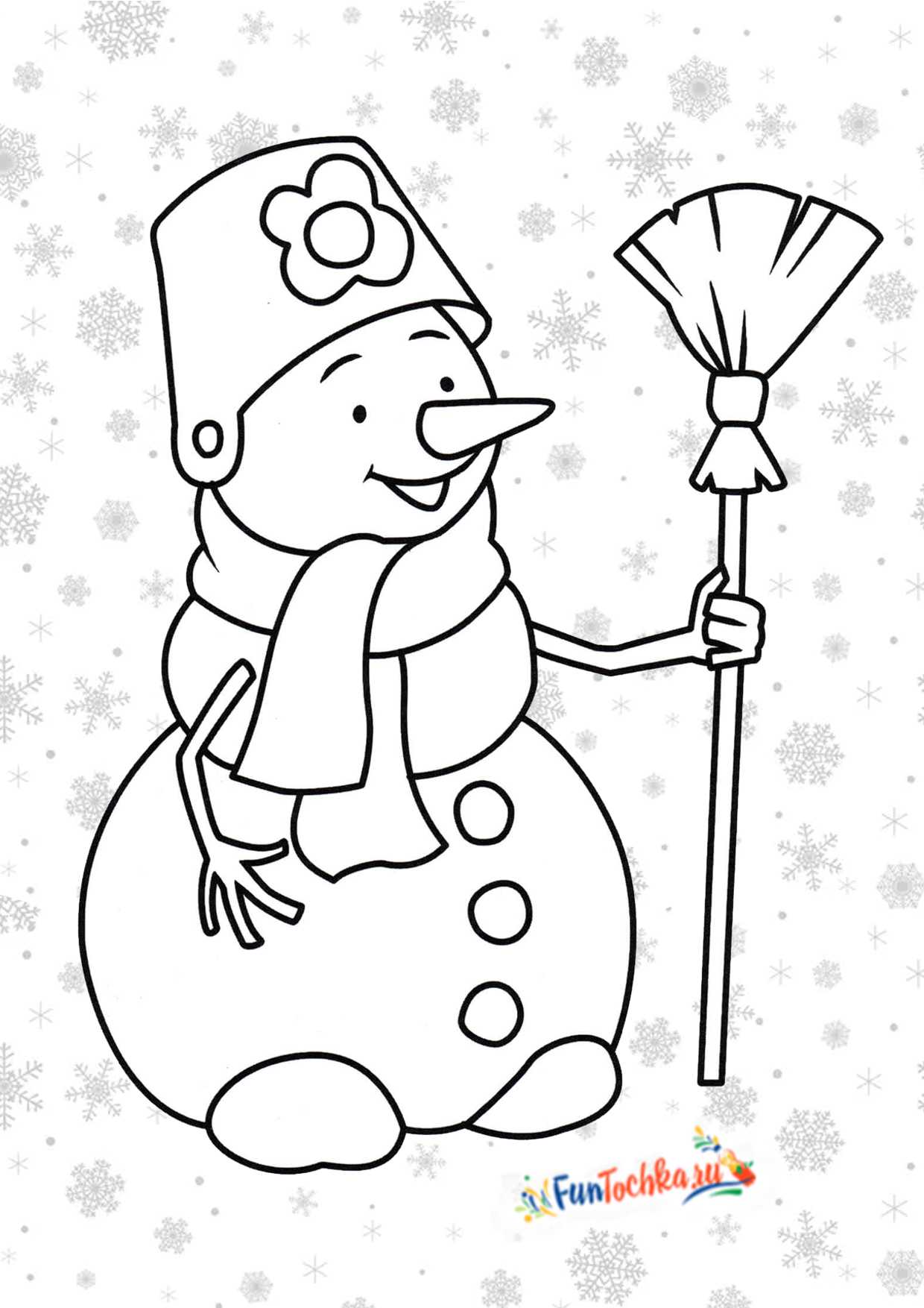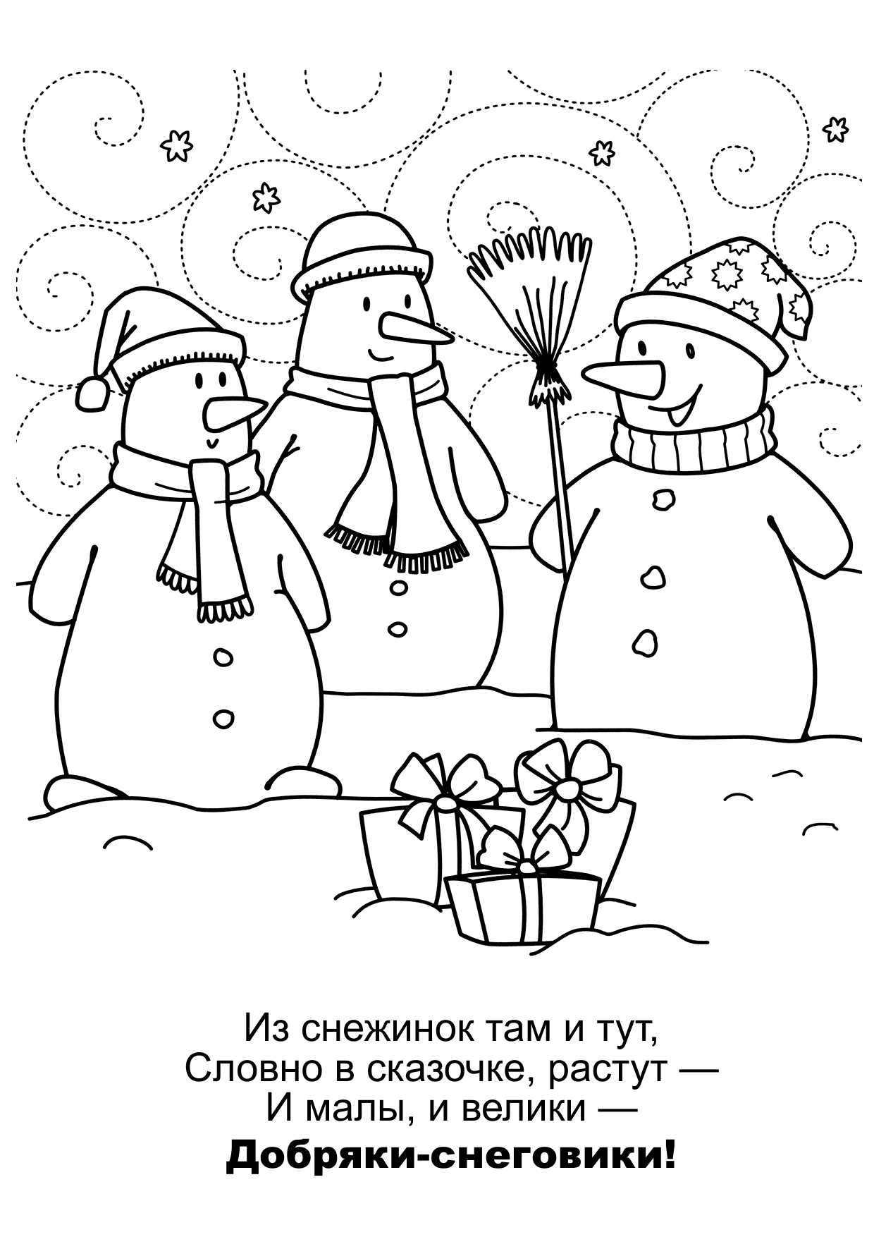 Немножко сложнее для детей 3-4 лет, но вы всегда можете отказаться от прорисовки маленьких предметов на раскраске или помочь ребенку.Ком скатали — в тот же миг Получился Снеговик: Двор метёлкой подмети И на праздник приходи!