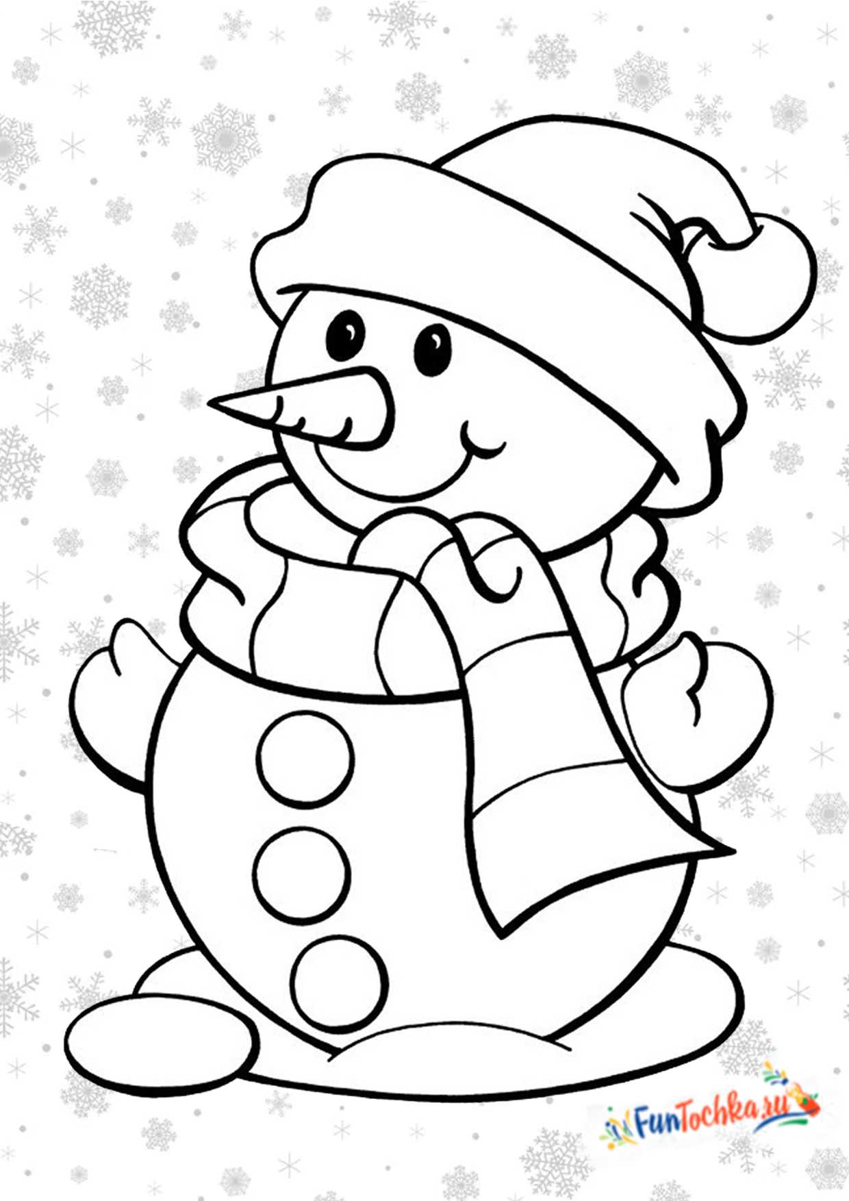 Вот раскраска для детей 3-4 лет с простым снеговиком в шапке. Скачать и распечатать — обязательно, и лучше всего использовать фломастеры. Фон тут готовый, а элементы одежды крупные, раскраска получится очень сочной.