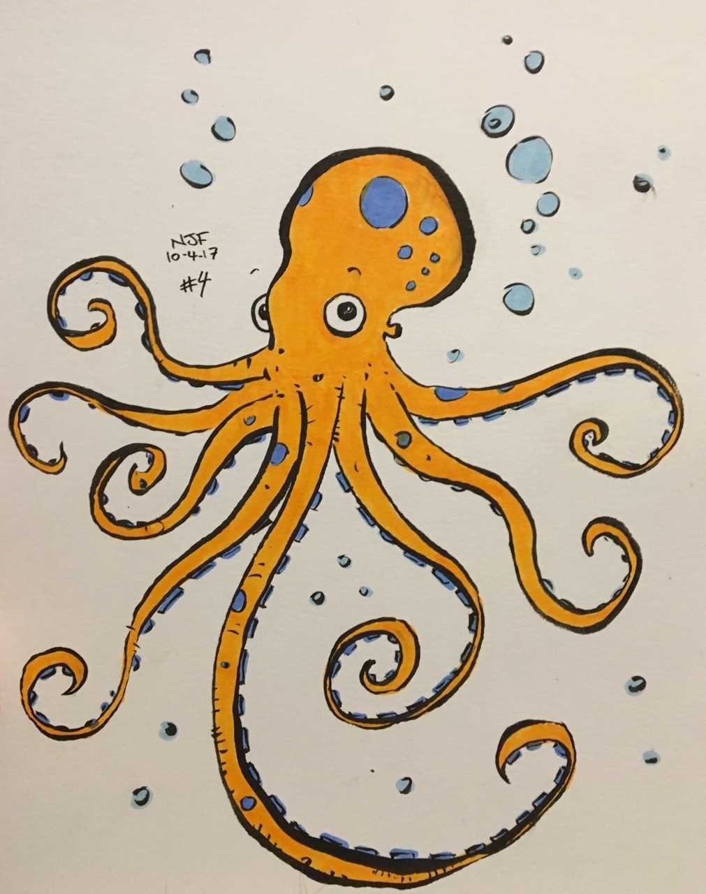 Все-таки рисунок это творчество. Вы можете одеть осьминога в любую одежду, нарисовать ему забавное выражение лица, вручить в щупальца разнообразные предметы все, что подскажет вам ваше воображение. Интереснее всего будет рисовать, руководствуясь предпочтениями детей, что помимо творческого развития поможет укрепить и ваши взаимоотношения.