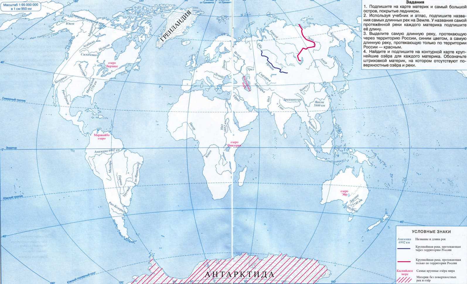 4. Найдите и подпишите на контурной карте крупнейшие озёра для каждого материка. Обозначьте штриховкой материк, на котором отсутствуют поверхностные озёра и реки.
