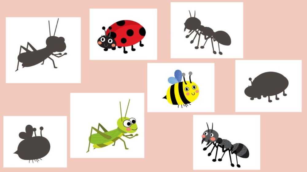 Для игры нужно подготовить картинки насекомых и их же силуэтные изображения. Задача играющего — подобрать тень к каждому объекту, назвать его видовую принадлежность и особенности жизнедеятельности.
