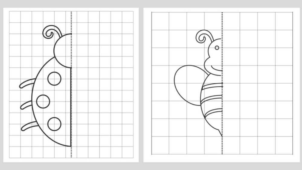 Для занятия нужно подготовить изображение на тетрадном листе в клетку. На нем необходимо нарисовать прямыми линиями схематичный образ левой половины жука. Задача дошкольника — изобразить точно такую правую половину, ориентируясь на схему. Ребенку нужно объяснить, что у него должно получиться зеркально отраженное изображение.