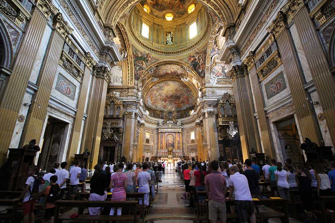 Впечатляющий пример архитектуры контрреформации, самая важная иезуитская церковь Рима — сказочный пример искусства барокко. Основные работы включают в себя фреску свода Джованни Баттисты Гаулли (он же Иль Бачичча) и роскошную гробницу Андреа дель Поццо для Игнатия Лойолы, испанского солдата и святого, который руководил иезуитами в 1540 году.