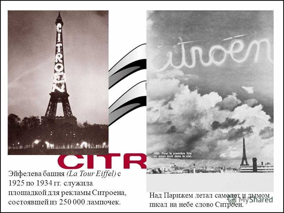 Эйфелева башня (La Tour Eiffel) с 1925 по 1934 гг. служила площадкой для рекламы Ситроена, состоявшей из лампочек. Над Парижем летал самолет и дымом писал на небе слово Ситроен.