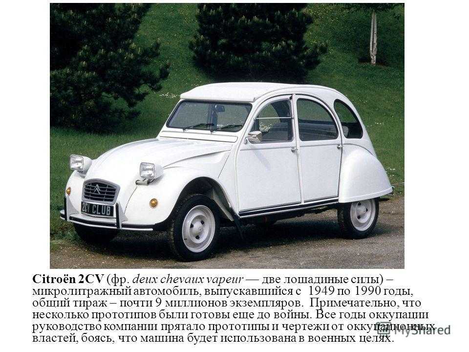 Citroën 2CV (фр. deux chevaux vapeur две лошадиные силы) – микролитражный автомобиль, выпускавшийся с 1949 по 1990 годы, общий тираж – почти 9 миллионов экземпляров. Примечательно, что несколько прототипов были готовы еще до войны. Все годы оккупации руководство компании прятало прототипы и чертежи от оккупационных властей, боясь, что машина будет использована в военных целях.