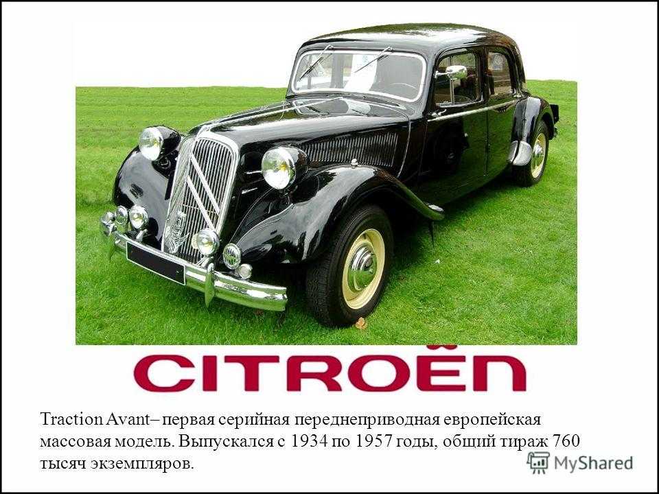 Traction Avant– первая серийная переднеприводная европейская массовая модель. Выпускался с 1934 по 1957 годы, общий тираж 760 тысяч экземпляров.