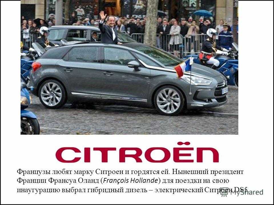 Французы любят марку Ситроен и гордятся ей. Нынешний президент Франции Франсуа Оланд ( François Hollande ) для поездки на свою инаугурацию выбрал гибридный дизель – электрический Ситроен DS5.