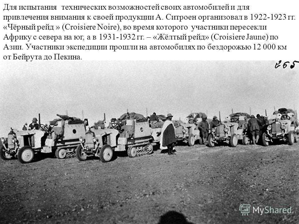 Для испытания технических возможностей своих автомобилей и для привлечения внимания к своей продукции А. Ситроен организовал в гг. «Чёрный рейд » (Croisiere Noire), во время которого участники пересекли Африку с севера на юг, а в гг. – «Жёлтый рейд» (Croisiere Jaune) по Азии. Участники экспедиции прошли на автомобилях по бездорожью км от Бейрута до Пекина.