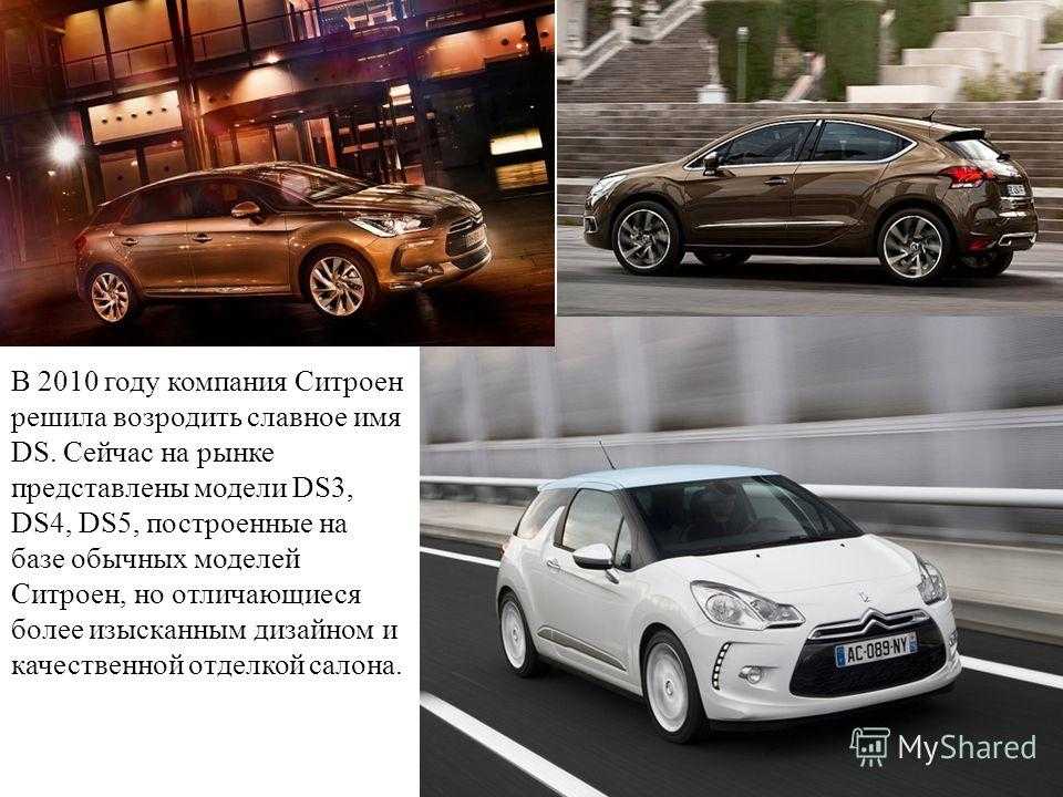 В 2010 году компания Ситроен решила возродить славное имя DS. Сейчас на рынке представлены модели DS3, DS4, DS5, построенные на базе обычных моделей Ситроен, но отличающиеся более изысканным дизайном и качественной отделкой салона.