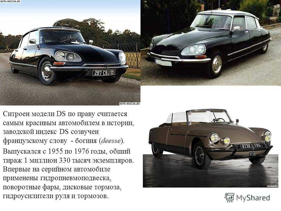 Ситроен модели DS по праву считается самым красивым автомобилем в истории, заводской индекс DS созвучен французскому слову — богиня (deesse). Выпускался с 1955 по 1976 годы, общий тираж 1 миллион 330 тысяч экземпляров. Впервые на серийном автомобиле применены гидропневмоподвеска, поворотные фары, дисковые тормоза, гидроусилители руля и тормозов.