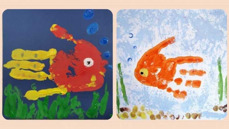 Отпечаток должен быть горизонтально направленным. Большой пальчик будет спинным плавником аквариумной рыбки, четыре остальных пальца — пышным хвостом, а середина кисти — телом. Когда рисунок подсохнет, останется подрисовать глазки и ротик на прилегающем к запястью участке отпечатка.