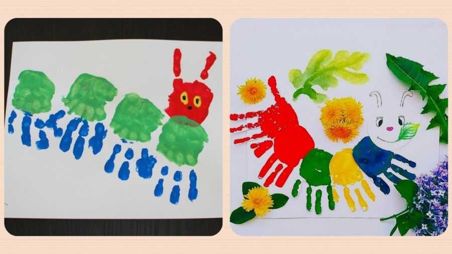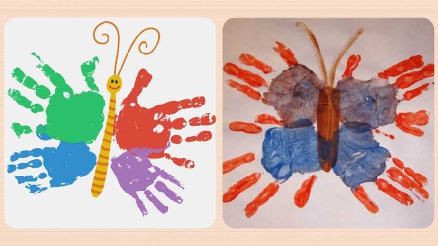 Педагог должен нарисовать тельце насекомого с усиками. Задача ребенка — изобразить крылышки, приложив выкрашенные яркими красками и растопыренные ладоши к листу с противоположных сторон от тельца и перпендикулярно ему.
