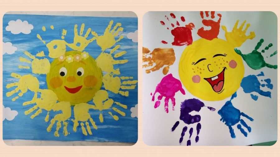 Это коллективный вариант работы. Педагог рисует солнечный шар с улыбкой и глазами. Задача детей — сделать руками лучи солнца. Каждый ребенок намазывает на ладошку краску теплого оттенка: красного, оранжевого, желтого. Затем делает отпечаток с внешней стороны контура изображенного солнышка.