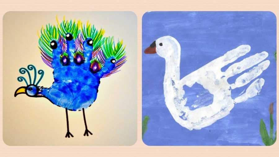 Отпечаток детской ладошки можно превратить в забавную птичку, например, снегиря, голубя, курочку, лебедя, фламинго, павлина, филина. Большой палец будет шеей птички, а четыре остальных пальчика — хвостом. Середина кисти — тело птички.