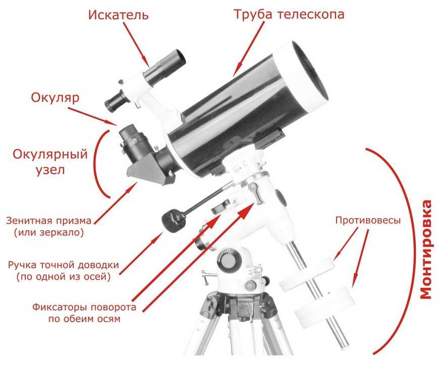 Телескоп состоит из трубы, которая стоит на специальной монтировке. Её оснащают осями для нацеливания на наблюдаемый объект.Кроме того, у оптического устройства имеется окуляр и объектив. Причём задняя плоскость объектива перпендикулярна оптической оси, и соединена с передней поверхностью окуляра. Которая, между прочим, аналогична объективной по отношению к оптической оси.
