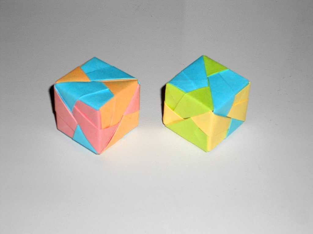 Имея знания, как сделать кубик из бумаги в технике оригами и изготовив поделку несколько раз, можно попробовать сконструировать кубик из модулей. Потребуется шесть листов цветной бумаги, желательно, чтобы листов было по 2 одинакового цвета. Что касается цветного картона, то для этой поделки его лучше не использовать.