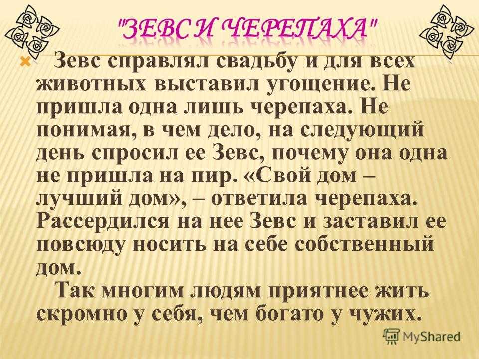 Зевс справлял свадьбу и для всех животных выставил угощение. Не пришла одна лишь черепаха. Не понимая, в чем дело, на следующий день спросил ее Зевс, почему она одна не пришла на пир. «Свой дом – лучший дом», – ответила черепаха. Рассердился на нее Зевс и заставил ее повсюду носить на себе собственный дом. Так многим людям приятнее жить скромно у себя, чем богато у чужих.