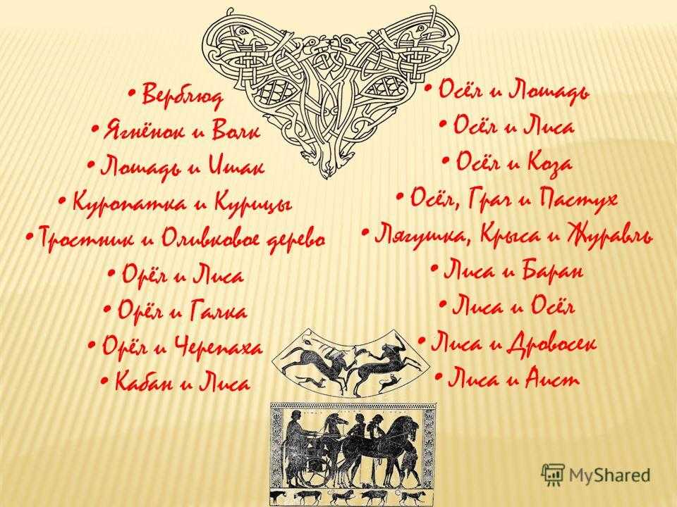 Верблюд Ягнёнок и Волк Лошадь и Ишак Куропатка и Курицы Тростник и Оливковое дерево Орёл и Лиса Орёл и Галка Орёл и Черепаха Кабан и Лиса Осёл и Лошадь Осёл и Лиса Осёл и Коза Осёл, Грач и Пастух Лягушка, Крыса и Журавль Лиса и Баран Лиса и Осёл Лиса и Дровосек Лиса и Аист