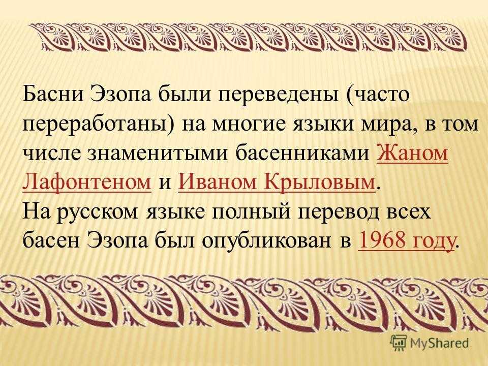 Басни Эзопа были переведены (часто переработаны) на многие языки мира, в том числе знаменитыми басенниками Жаном Лафонтеном и Иваном Крыловым.Жаном Лафонтеном Иваном Крыловым На русском языке полный перевод всех басен Эзопа был опубликован в 1968 году.1968 году