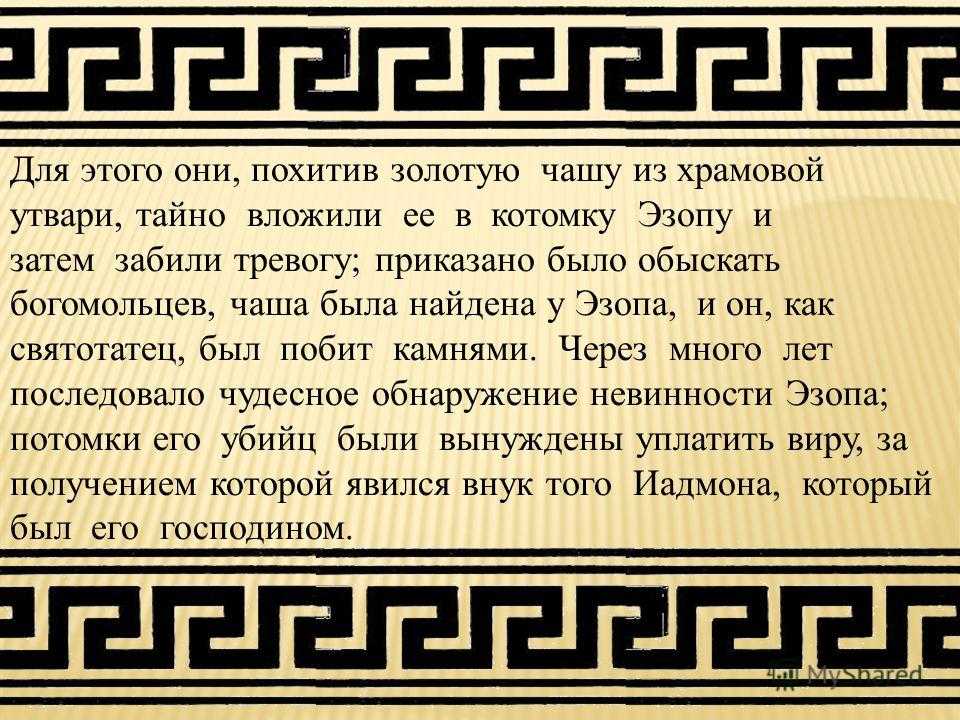 Для этого они, похитив золотую чашу из храмовой утвари, тайно вложили ее в котомку Эзопу и затем забили тревогу; приказано было обыскать богомольцев, чаша была найдена у Эзопа, и он, как святотатец, был побит камнями. Через много лет последовало чудесное обнаружение невинности Эзопа; потомки его убийц были вынуждены уплатить виру, за получением которой явился внук того Иадмона, который был его господином.