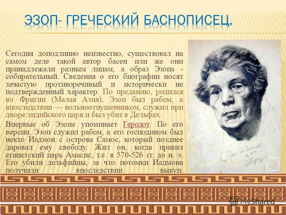 Эзоп родился и жил в VI веке до н. э. Самые известные легенды говорят о том, что, к сожалению, баснописец был рабом. Данная теория получила распространение благодаря работам историка Геродота.