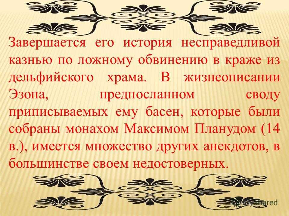 Завершается его история несправедливой казнью по ложному обвинению в краже из дельфийского храма. В жизнеописании Эзопа, предпосланном своду приписываемых ему басен, которые были собраны монахом Максимом Планудом (14 в.), имеется множество других анекдотов, в большинстве своем недостоверных.