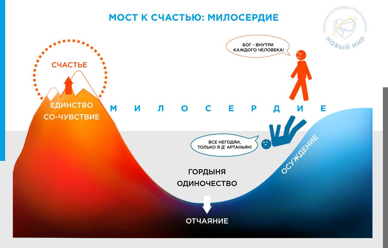 Основа подлинного милосердия – уважение к пути человека и признание его права быть собой, права на ошибки и поиски. Божественная суть лежит в основе каждого из нас. И каждый из нас хочет быть счастливым. Только вот понимание счастья у всех разное – в зависимости от И потому в процессе поисков своего счастья часто причиняется вред другим… Все эти страшные поступки и деяния – плоды невежества и неосознанности. «Прости их, Господи, ибо не ведают, что творят!»