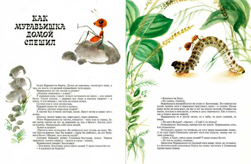 В сказке «Как Муравьишка домой спешил» главного героя, сидящего на листике, ветром унесло за реку, и другие насекомые помогли ему добраться домой до захода солнца. Это — сказка. А вот описание методов передвижения разных насекомых (и не только) — это уже несказка. Жужелица быстро бегает, Землемер ползает, сгибаясь и распрямляясь, Жучок-Блошачок прыгает, Кузнечик тоже прыгает, но гораздо выше и дальше, Водомер бегает по воде… Майский Хрущ — летает, но крылья у него спрятаны, чтобы полететь, ему надо раскрыть спину (надкрылья). Гусеница-листовёртка может висеть на ниточке.Вот так в короткой, но занимательной и поучительной сказке, Бианки мог много рассказать о природе.